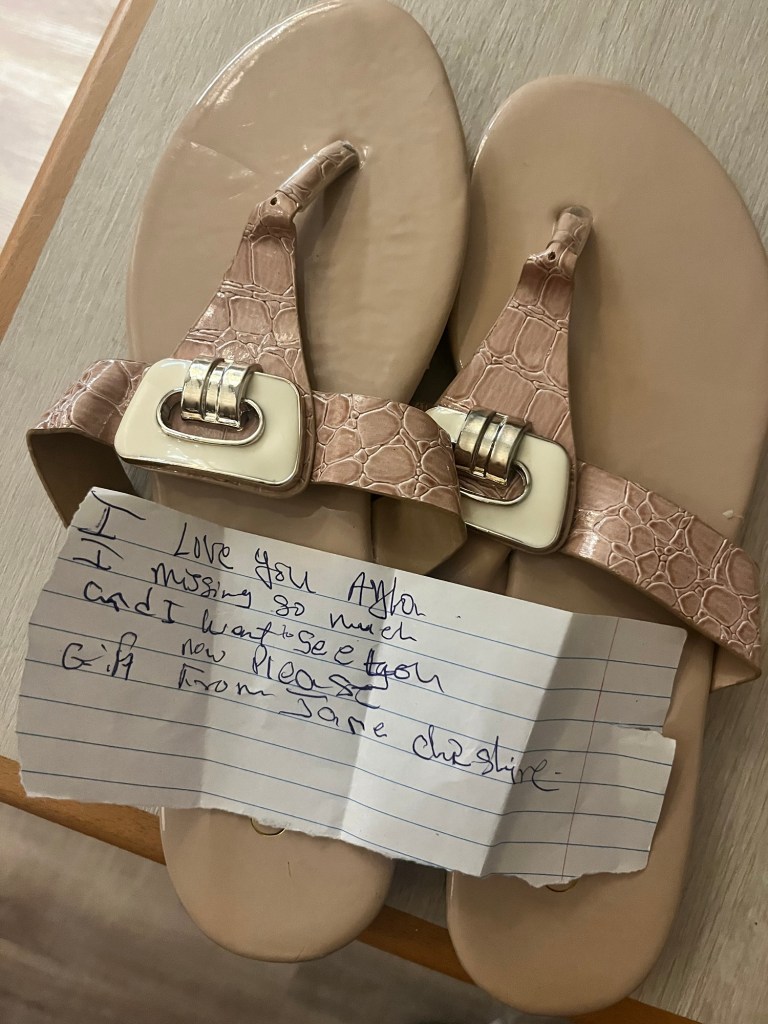 Today was another Monday I wasn’t able to visit Cheshire or Jane and after a long day, one of those days where anxiety had crept in, where I felt small and overwhelmed, I came back to my room and found a gift waiting for me. A small package sat by my door. I opened it, and inside was a pair of sandals, carefully wrapped, with a handwritten note: