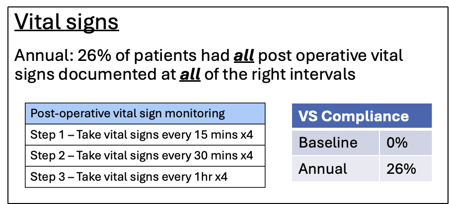 Honestly, we had no idea what to expect when we did our annual data collection. But by the end of the year, 26% of patients had all post operative vital signs documented at all of the right intervals. Now, 26% might not sound impressive at first glance, but in this context, it is groundbreaking. It means that over a quarter of patients who previously would not have been monitored properly were now being assessed consistently, giving nurses the chance to catch deterioration earlier and intervene faster. In a setting where resources are limited, this improvement is a massive step forward, and it represents real lives saved. On top of that our data showed that 59% of patients were receiving vitals 10 or more times in the first 12 hours. That’s nearly a full set and a massive improvement from 0%.