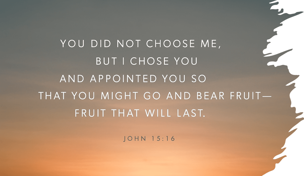 Jesus said in John 15:16, “You did not choose me, but I chose you and appointed you so that you might go and bear fruit – fruit that will last.”